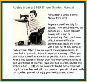 I am at a loss for words. Actually no I am not. Chris often sees me in my pajamas all day on a Saturday. He might softly mention that it might be good to take a shower, but he often sees me at my worst, and he has only seen me with lipstick a handful of times in our 12+ years together. My how the world has changed in the last 65 years. I will have to get my hands on a 2015 Singer Sewing manual so I can be inspired by their advice and all the things I should do before I start to sew.