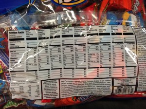 Yesterday at work I opened a bag of mixed fun size candy bars from Costco. Of course because of just reading Schaub’s book I was very curious about the sugar amounts. You’ll have to click the photo to be able to read the packaging, but in order to truly know how many grams of sugar was in each serving size you have to take the number of candy bars per serving size and divide it by total number of sugar calories.